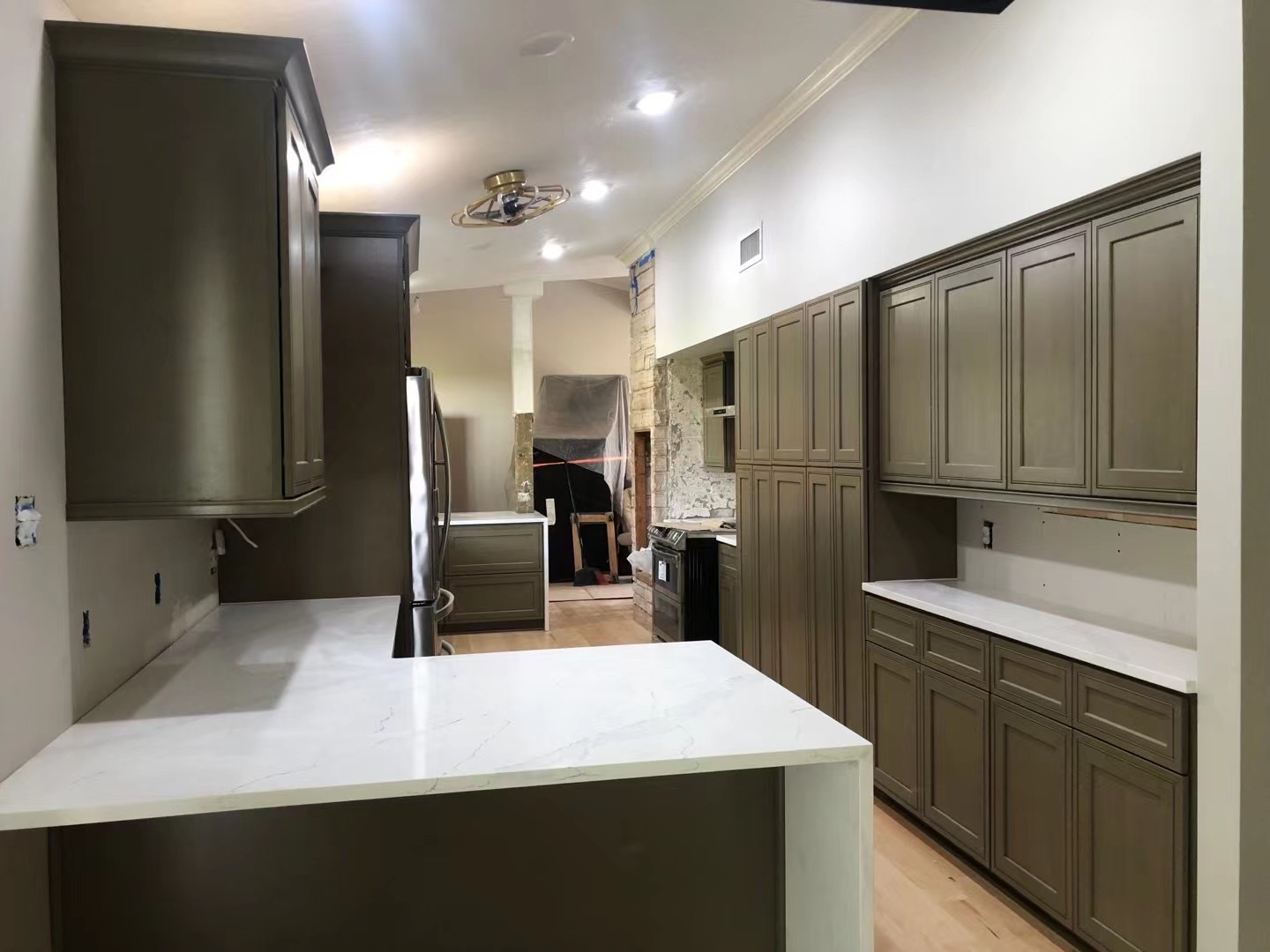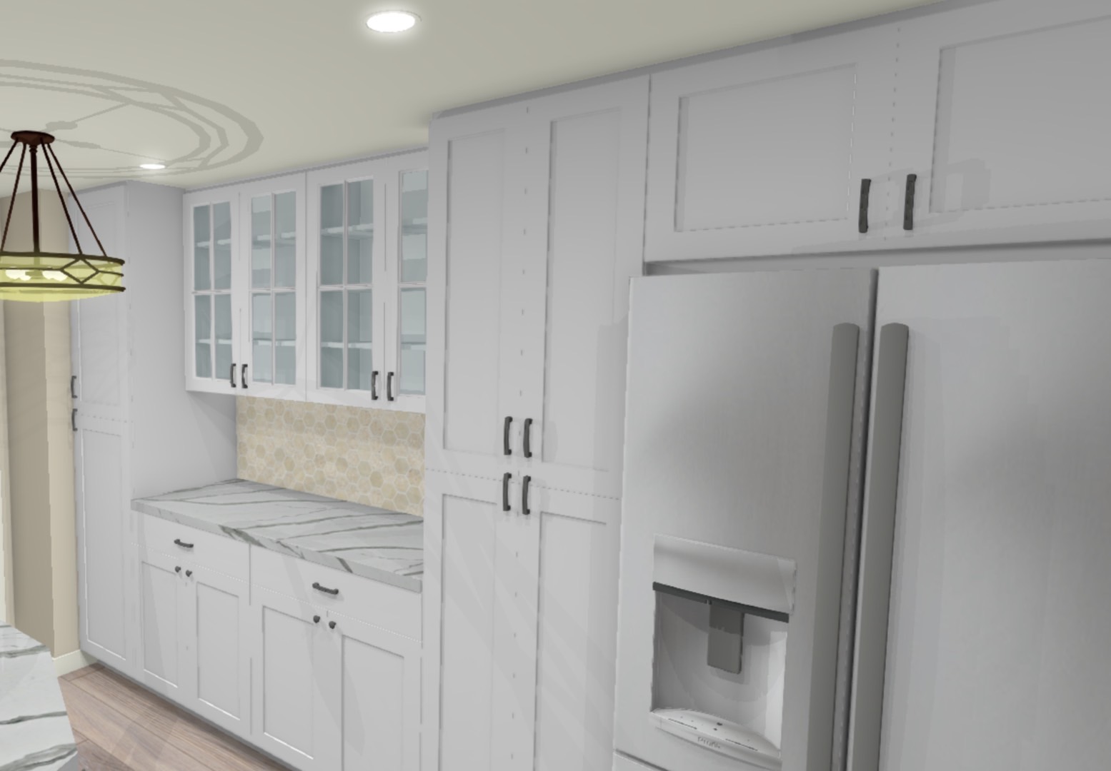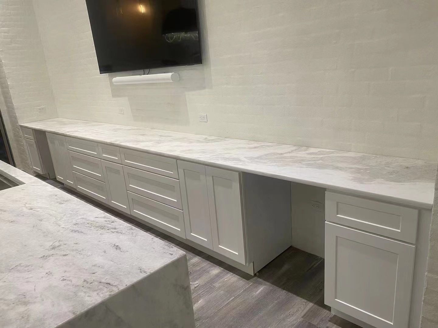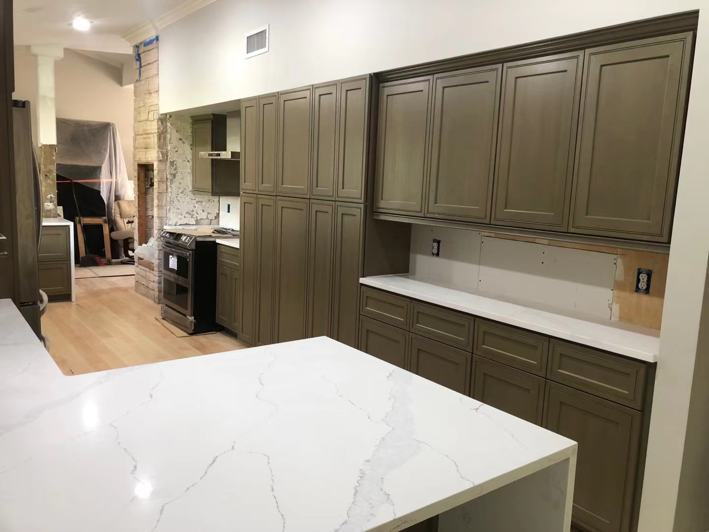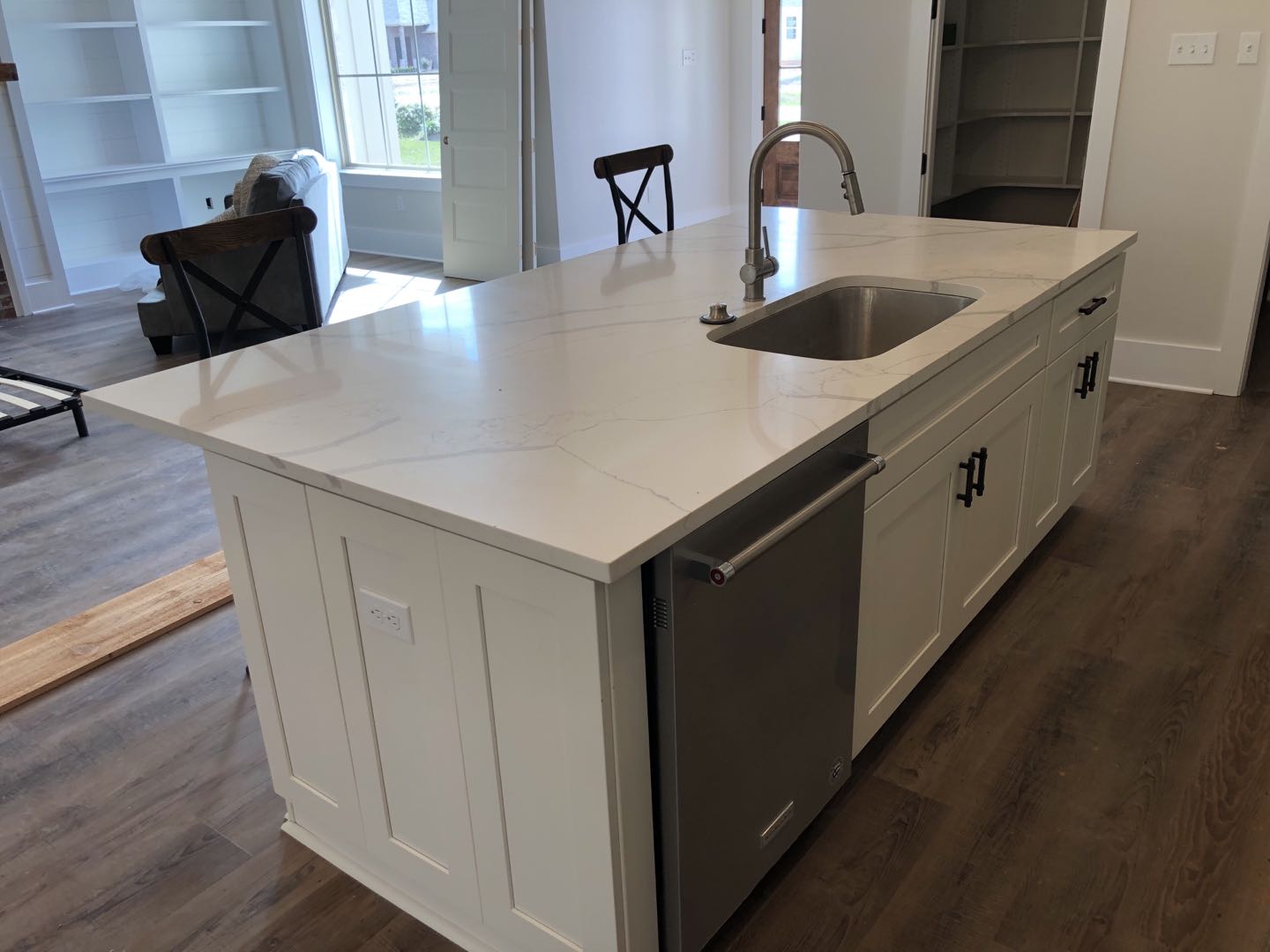 –WHITE SHAKER WITH ESPRESSO ISLAND , WATERFALL QUARTZ