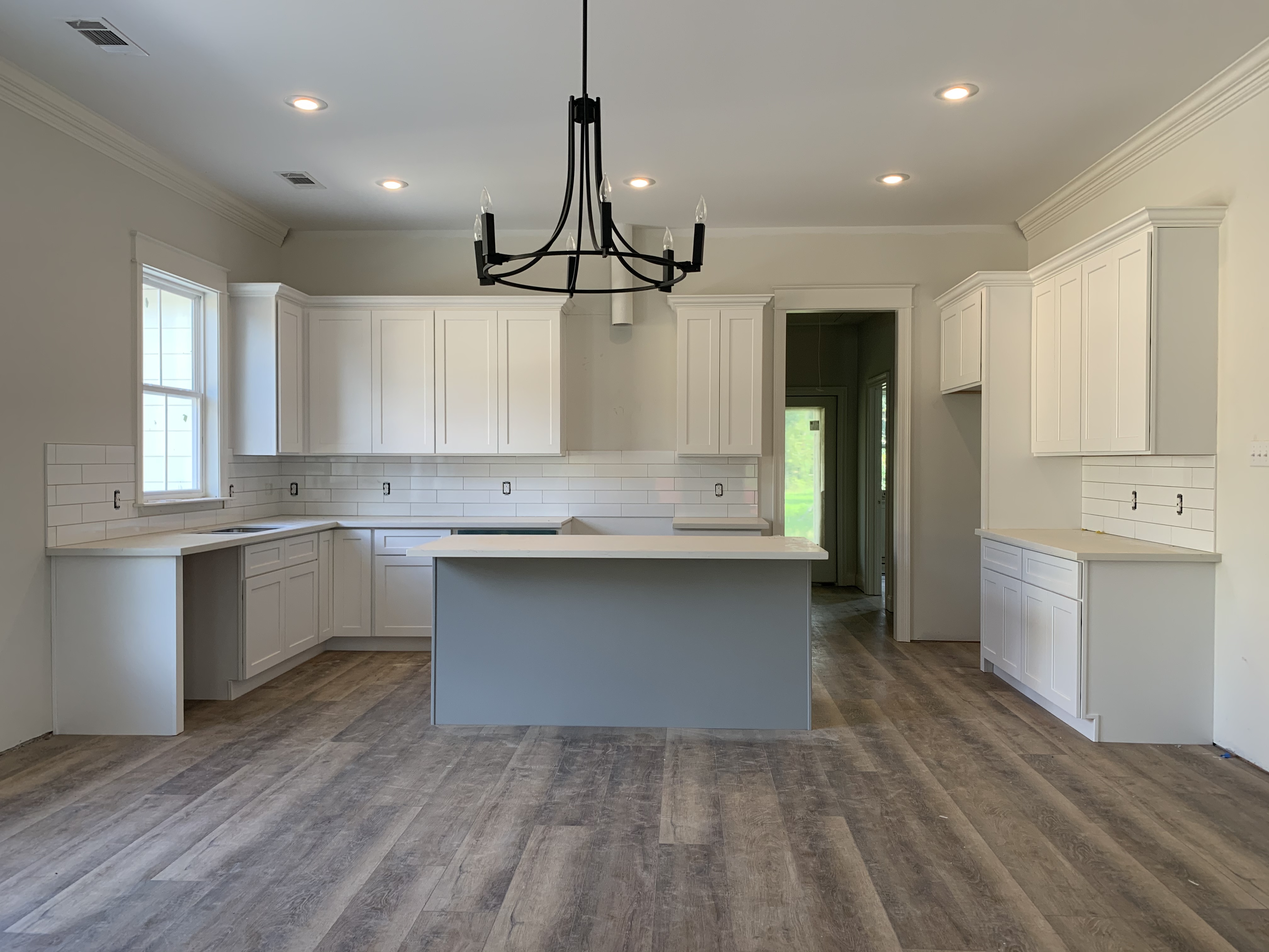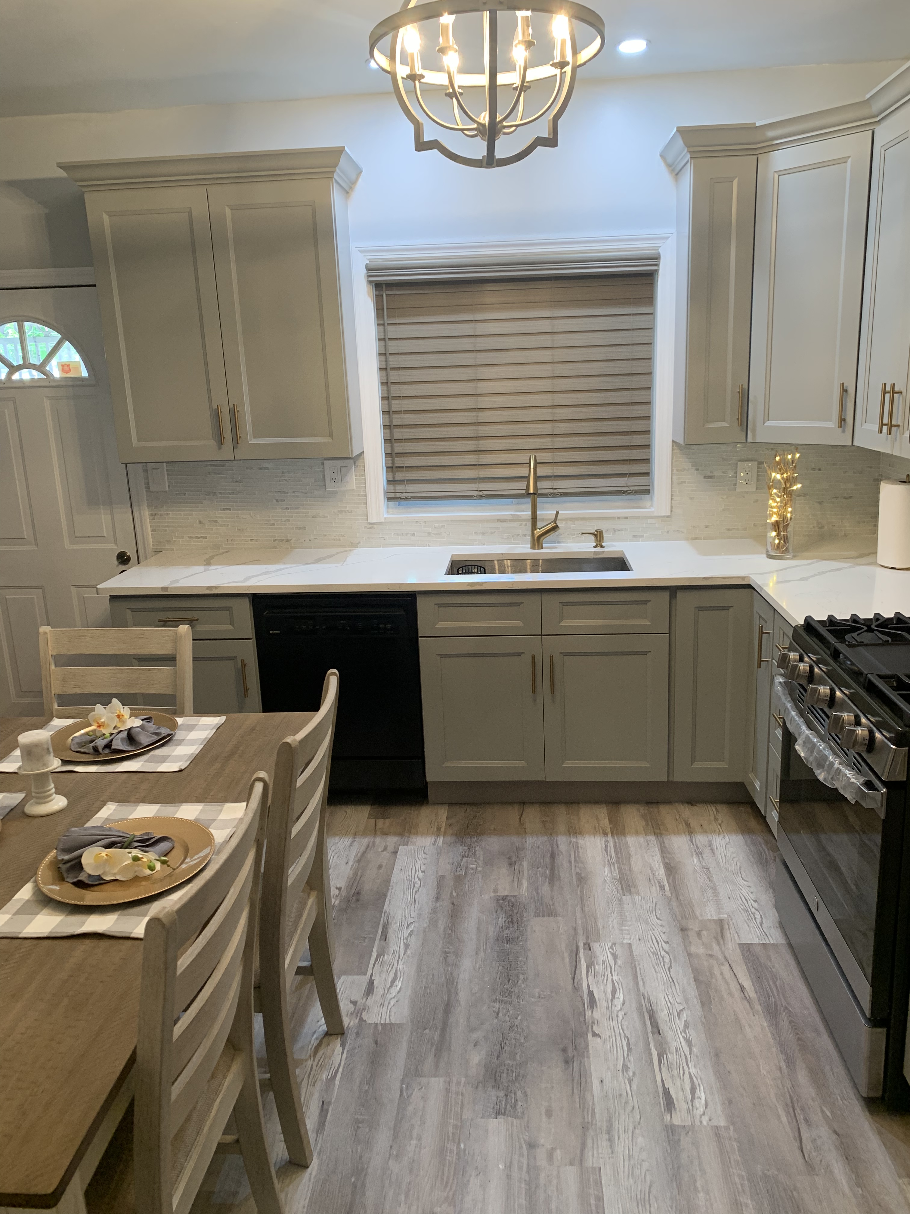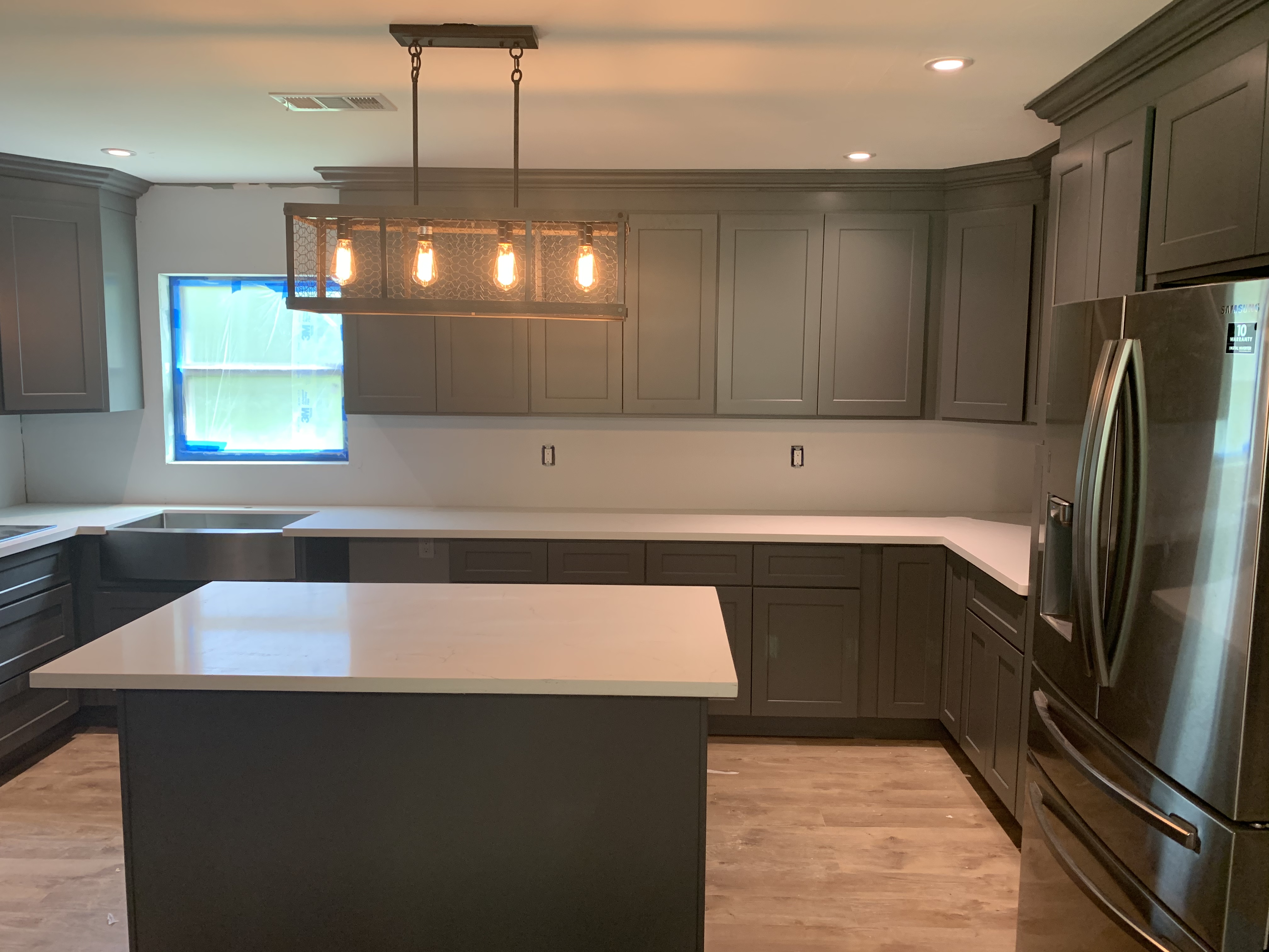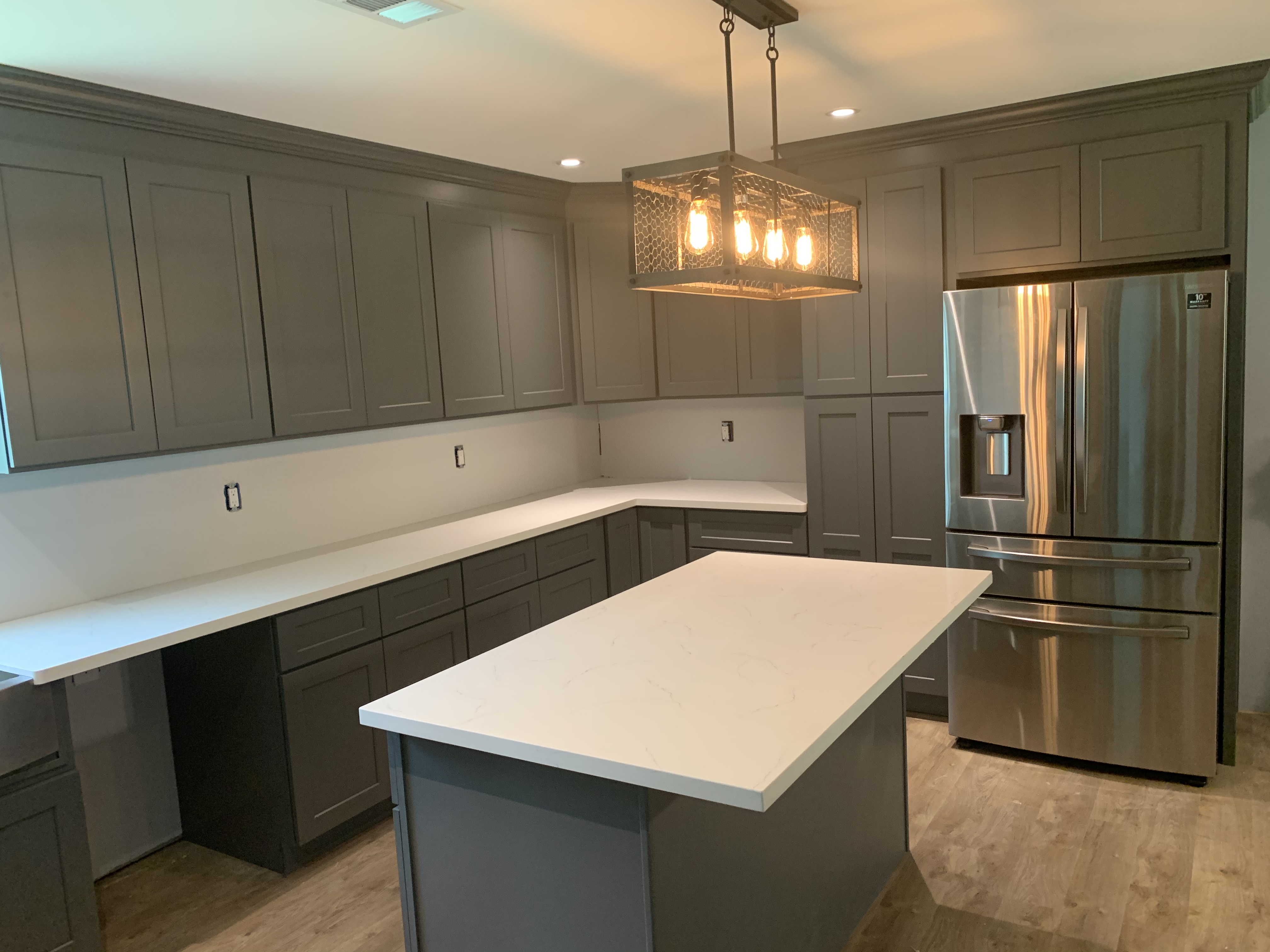 –WHITE SHAKER WITH GREY SHAKER ISLAND AND QUARTZ COUNTERTOP —