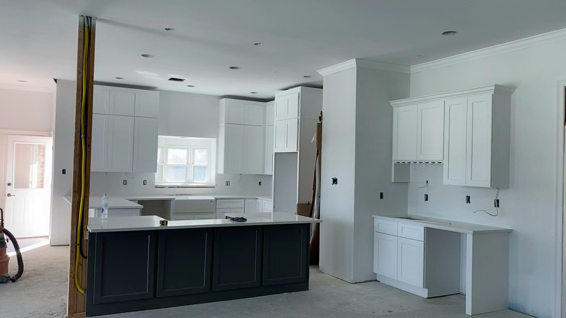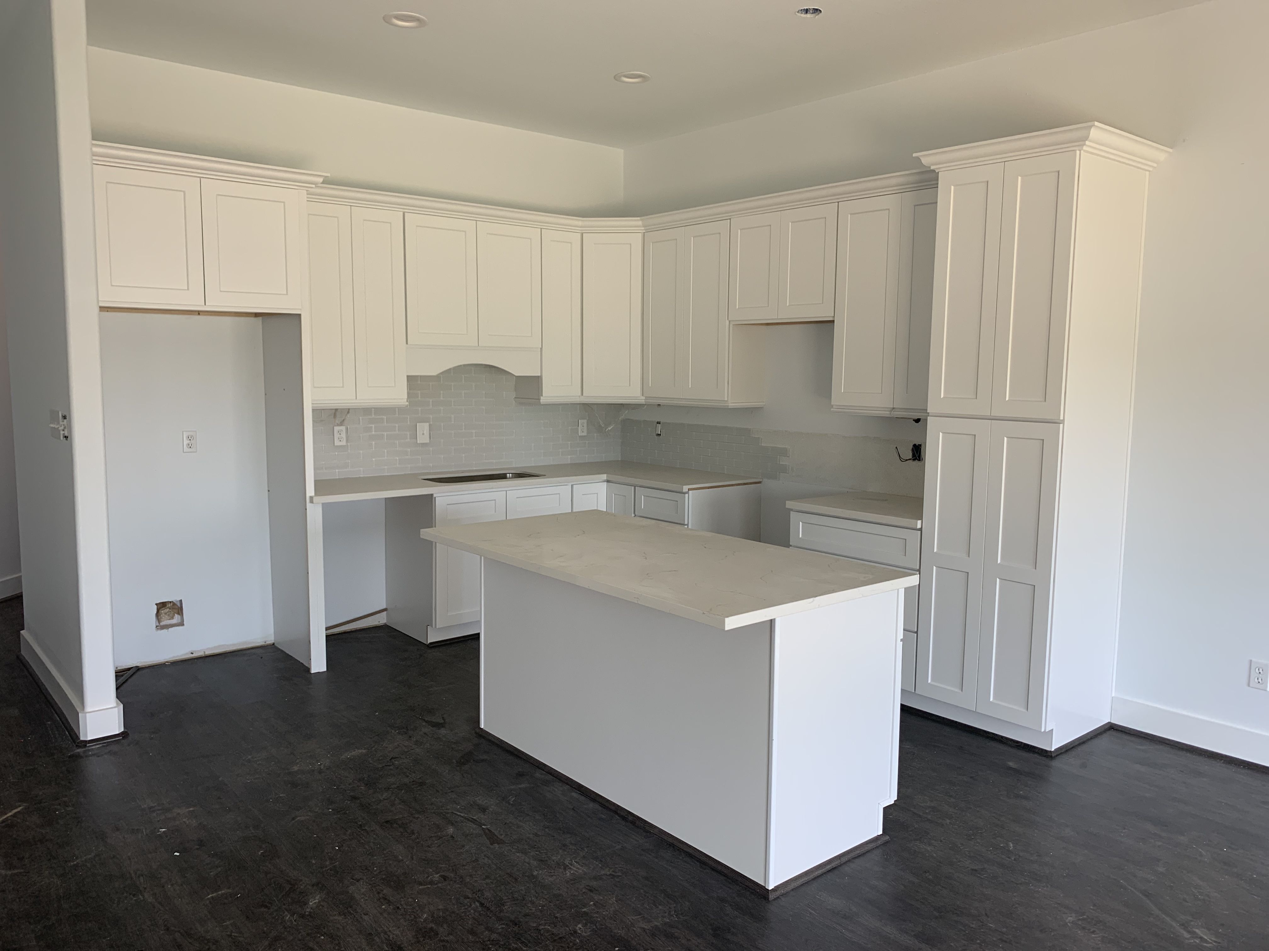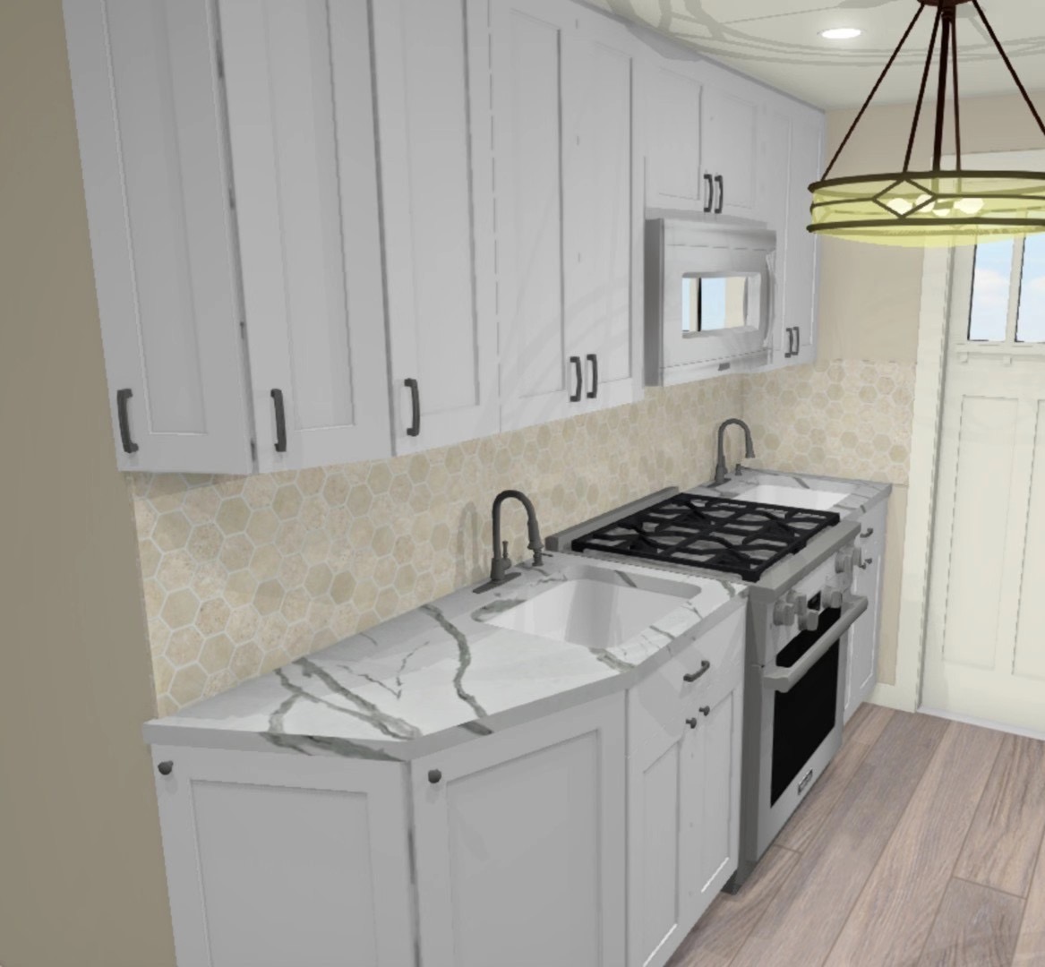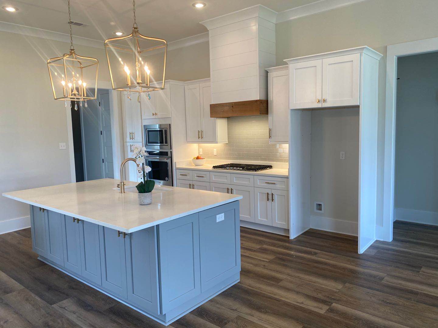 –WHITE SHAKER WITH GREY SHAKER ISLAND AND QUARTZ COUNTERTOP —